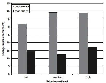 话虽如此,Tillema及其同事发现,在奖励计划中,大约37%的汽车出行在高峰时段被转移,而在定价计划中,估计只有约15%会改变时间。这一差异在三种奖励和惩罚水平中都相当一致。在这两种情况下,方案本身的引入对行为的改变产生了最大的影响,随着成本或奖励的增加,回报递减: