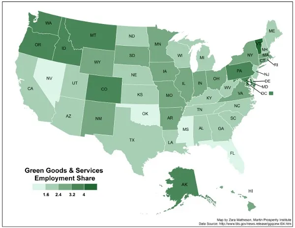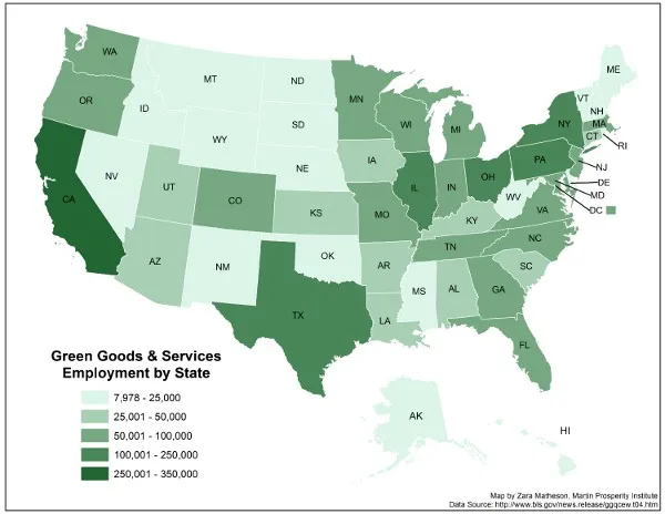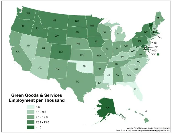 我的同事扎拉·马西森在 马丁繁荣研究所 使用BLS数据绘制了50个州和哥伦比亚特区绿色就业的分布图。