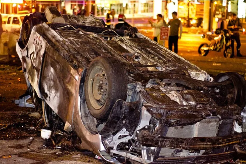 2011年骚乱后翻倒的汽车图片,来自 rommy ghaly。