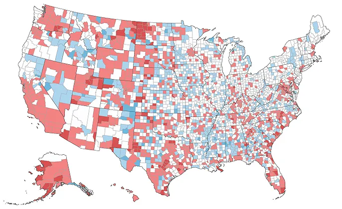 以下是2006年美国人口变化的情况(人口增长为红色,减少为蓝色):
