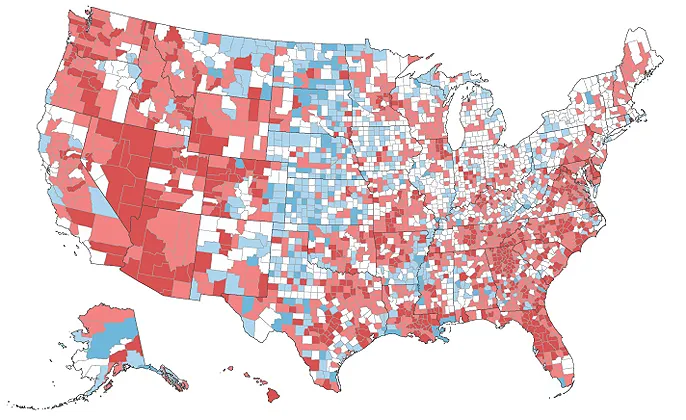 以下是2006年美国人口变化的情况(人口增长为红色,减少为蓝色):