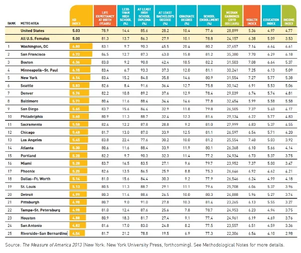 华盛顿特区在构成整体指数的三个类别中有两个类别排名第一:女性收入和教育水平。华盛顿大都会区女性的中位收入为38,000美元,比美国整体的中位个人收入高出9,000美元,比河滨-圣贝纳迪诺高出16,000美元。旧金山在一个类别中排名第一,即预期寿命,并在所有三个类别中均位列前三。旧金山和巴尔的摩在女性收入方面分别排名第二和第三,而波士顿和旧金山在女性教育水平方面分别排名第二和第三。洛杉矶和圣地亚哥在预期寿命方面排名第二和第三。