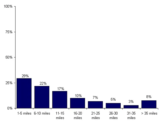 美国交通部和交通统计局的一项研究发现,平均通勤距离约为15英里。如下图所示,超过三分之二的通勤者通勤15英里或更短。然而,11%的人每次通勤超过30英里。