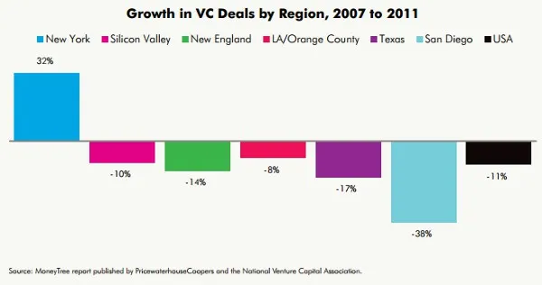 根据普华永道和国家风险投资协会发布的MoneyTree报告,在美国七大领先科技区域中,纽约市是唯一一个在2007年至2011年间看到风险投资交易数量增加的城市。在此期间,纽约的交易数量增长了32%,而其他地区的风险活动显著下降,包括硅谷(-10%)、新英格兰(-14%)、洛杉矶/橙县(-8%)、德克萨斯州(-17%)和圣地亚哥(-38%)。全国范围内,风险投资交易下降了11%。