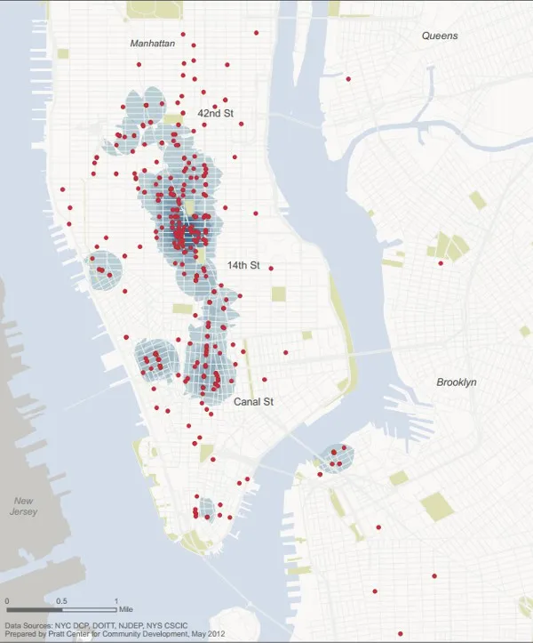 纽约作为科技中心的崛起是从旧的“书呆子”模式向新的、更密集的城市化模式转变的一部分。简·雅各布斯早就注意到,在像纽约这样的大型、多样化和密集的城市中,创新和创造力的聚集发生在可步行的社区中,这些社区创造了街头的偶然性,她著名地写道:“新想法必须利用旧建筑。”