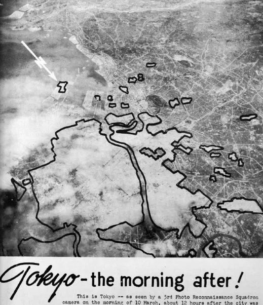 1945年3月10日,279架B-29轰炸机在前一张地图上的“目标区1”投下了1665吨炸弹。空袭造成大约84,000人死亡(如果不是更多的话),40,000人受伤,导致一百万人无家可归,Fedman和Karacas报告称。这张在空袭后不久拍摄的被轰炸地区的图片,刊登在《空中情报摘要》中。Fedman和Karacas写道,随附的文字“几乎抹去了平民的存在”,而是使用了与军事相关的描述,如“家庭工厂”和“熟练工人”。来源:国会图书馆