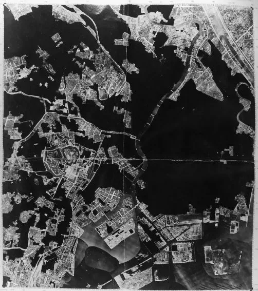 在3月10日东京轰炸后,XXI轰炸机指挥部的指挥官柯蒂斯·勒梅将军决定攻击名古屋、大阪和神户。到本月底,美国军方已焚烧了这四个城市的32平方英里,激发了对日本六大城市的更多轰炸,这一行动持续到6月。这张地图,“东京第7号马赛克地图”,显示了截至此时东京中心的损毁情况。来源:美国国家档案馆