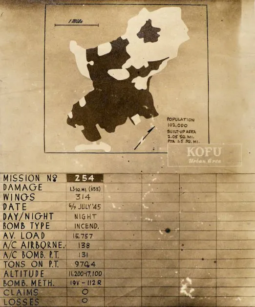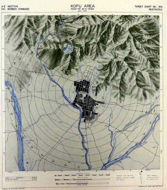 在轰炸日本最大城市后,美国陆军航空队将注意力转向中小城市——总共摧毁了大约65个城市。虽然较大城市附近有足够的军事目标来证明轰炸的合理性,但较小城市并不总是如此。XXI轰炸机指挥部的甲府市地图,“目标图52A,甲府地区”,就是一个明显的例子:“整个城市区域内没有列出军事目标,地图的中心焦点是城市的建成中心,”Fedman和Karacas写道。来源:美国国家档案馆