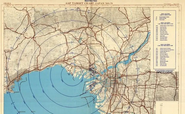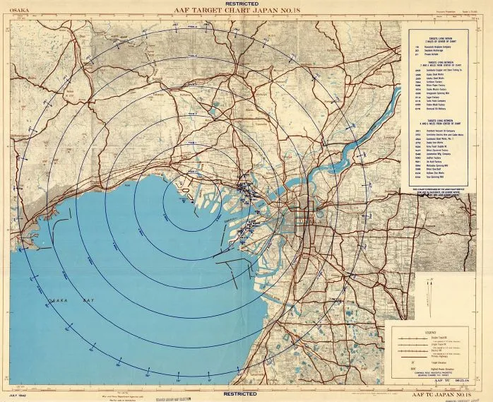 为了补充O.S.S.的工作,战争部、陆军和陆军航空队创建了他们自己的日本城市地图。费德曼和卡拉卡斯报告称,战争初期这些地图的目标是军事的。这张1942年7月的空军地图“AAF目标日本第18号 - 大阪”中的同心圆旨在削弱川西飞机公司及其生产的战斗机。来源:斯坦福大学布兰纳图书馆