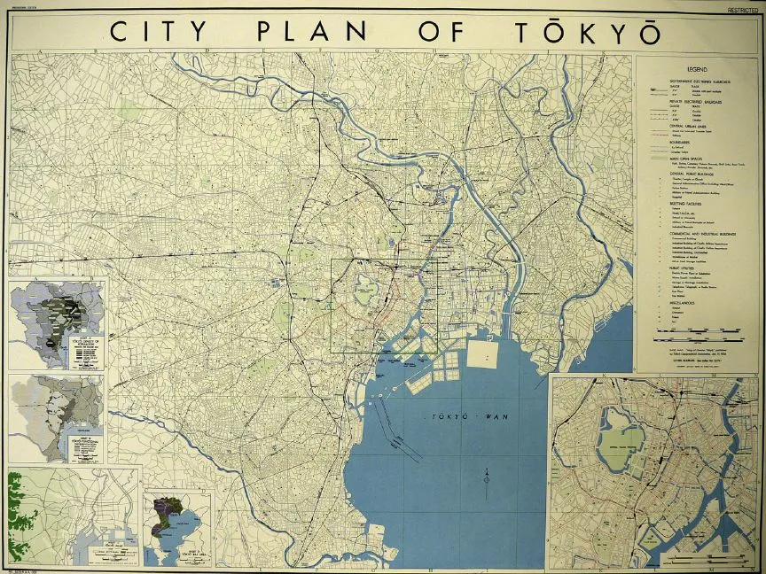 O.S.S.的地图部门——一个由150名地理学家、制图师、绘图员等组成的团队——在第二次世界大战期间制作了大约8000张地图。他们常常依赖日本制作的测量地图;在这张地图中,“东京城市规划,1944年10月”就是如此。除了一般的城市地图外,O.S.S.部门还绘制了城市道路、国家城市网络以及特定城市功能的地图,如制造业、贸易、采矿、渔业等。来源:美国国家档案馆