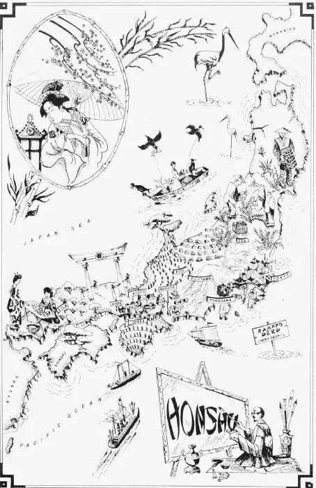 在1945年7月对甲府市的攻击之后,第二十一轰炸机指挥部制作了这张损害地图(恰如其分地称为“甲府市损害报告地图,1945年7月”)。这张粗略的地图没有军事相关目标,描绘了甲府的模糊轮廓,用黑色表示破坏,并未传达超出人口的信息。随着城市中所有生活空间的迹象被清除,这幅图像被认为是“城市灭绝的清晰视觉表现……无与伦比,”Fedman和Karacas总结道。来源:美国国家档案馆日本在投降后进行的占领需要立即重新人性化日本人民。与其庆祝空袭的成功,战后地图移除了“甚至最微薄的破坏痕迹”——这是一种“制图上的粉饰”,Fedman和Karacas写道。这张包含在军方的“日本指南”中的日本本州主要岛屿的总体地图,用Fedman和Karacas所称的“精致、女性化的景观”取代了城市废墟的描绘。(来源:“日本指南”,美国陆军,1945年9月)