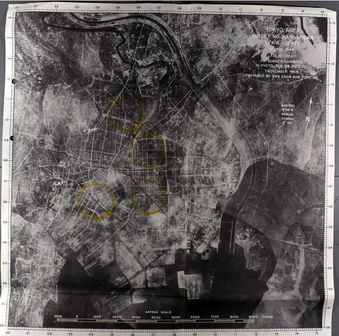 1945年2月,陆军航空队的第21轰炸指挥部进行了名古屋和东京的试验轰炸,随后一个月,其B-29轰炸机在多个城市区域展开攻击。早期的地图集中在军事目标上,而现在的目标则是整个社区。这张第21轰炸指挥部的地图“东京地区 - 目标90.17城市”,标出了用大黄色圆圈表示的投放区。“‘目标区1’的包含,即位于这四个点内的密集人口下町区,成为城市灭绝规划中的一个不祥时刻,”Fedman和Karacas写道。来源:美国国家档案馆
