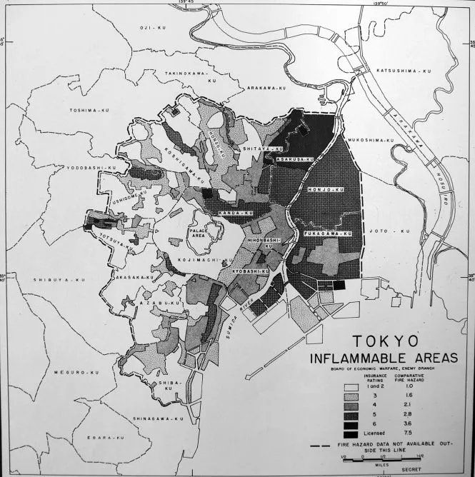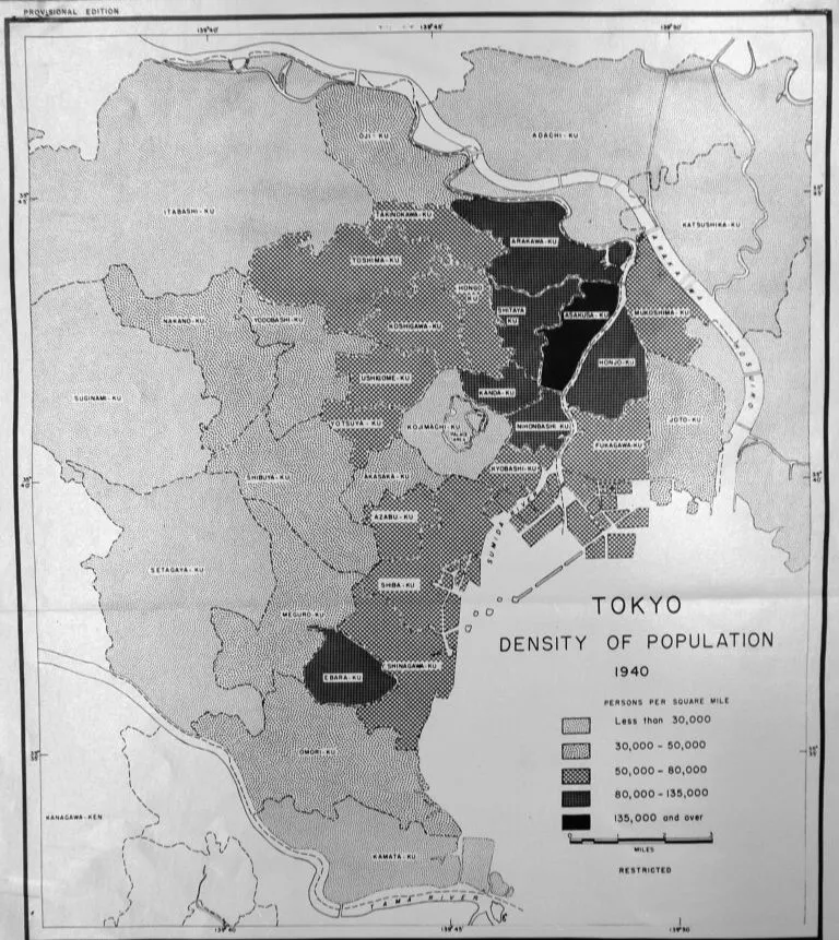 到1944年,Fedman和Karacas写道,美国军方准备在实践中利用日本城市的可燃性。一份情报报告提出了针对日本六个最人口密集城市(东京、大阪、横滨、川崎、名古屋和神户;总人口:1500万)的目标,估计摧毁这些城市70%的住房将使日本的工业产出减少15%。报告的作者可能参考了像“O.S.S.于1942年10月制作的‘东京:人口密度,1940’”这样的地图。来源:美国国家档案馆