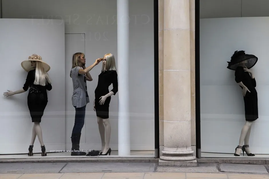 顶部图片:一名女性在伦敦梅费尔的一家商店橱窗中为一个模特梳理头发,2012年5月21日。(路透社/斯特凡·维尔穆斯)