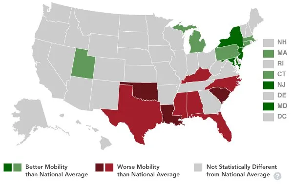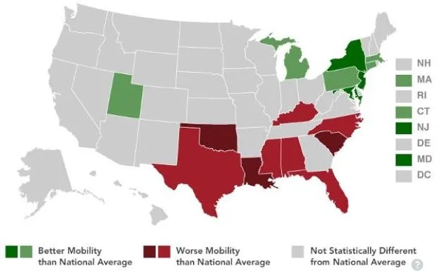根据来自 经济流动性项目 的一项重要新研究,皮尤州中心,经济流动性在美国的地理上也有所不同。上面的地图显示,经济流动性在新英格兰和中大西洋州最高,尤其是纽约、新泽西和马里兰。居民经历最低经济流动性的州都在南方,路易斯安那州、俄克拉荷马州和南卡罗来纳州得分最低。