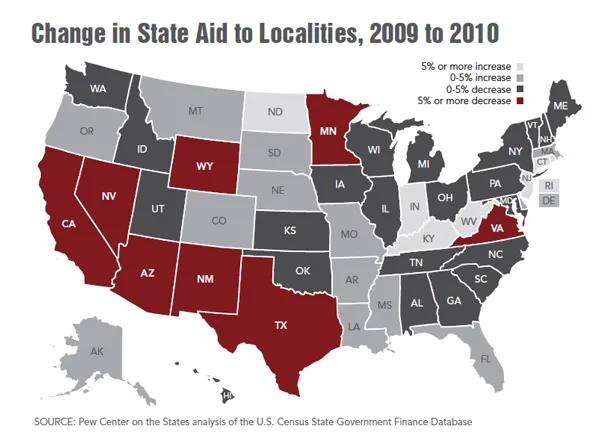 例如,州援助大约占地方政府预算的三分之一。报告指出,2010年全国州援助减少了约126亿美元,减少了2.6%。尽管2011财年的完整数据尚不可用,但报告显示26个州报告了类似的削减,至少18个州在2012财年进行了削减。