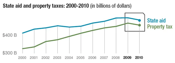 在2010财年,州援助和地方政府财产税收入的减少总计超过250亿美元,较前一年减少。