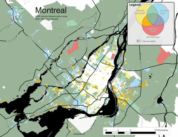 研究人员还收集了典型郊区特征的数据——独栋住宅的普遍性、房屋拥有率和单独通勤——并将其绘制在重叠实例的维恩图中,以描绘这些郊区特征出现的地方。
