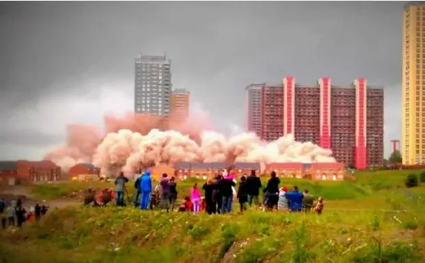 公寓开发中的八栋建筑中的第一栋经历了受控拆除,除了基础外,全部变成了碎片。机器将在未来几个月内清除剩余部分。剩余的被认定为不适合居住的物业——在1960年代末建造时是欧洲最高的公寓楼——将经历类似的爆破,直到2017年没有一栋建筑屹立。