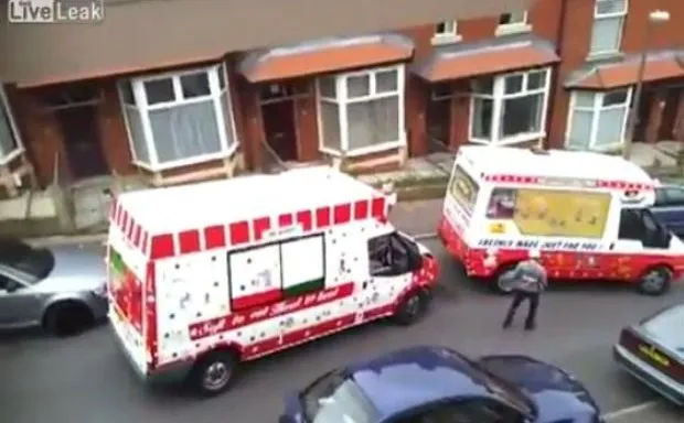 我是在偶然看到这段视频后了解到“格拉斯哥冰淇淋战争”的,视频中两名司机以破玻璃的方式解决争端。一名男子砸碎了对手的挡风玻璃,另一名男子则撞向对手的卡车,显然在苏格兰的移动甜点配送世界中并不太平: