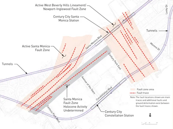 但那个最初的计划被扔掉了,因为它实际上被发现是不安全的。除了歇斯底里和情绪外,实际上这里有很多科学依据。2011年10月的一份报告[PDF]关于地铁站替代方案区域的断层线发现,建议的圣塔莫尼卡大道下方的线路将直接进入一个活跃的断层——这是地球沉积物中的一个可观察的不连续性,源于最近的地震,并且可能是未来不久将发生地震的地点。换句话说,这不是一个适合建造地铁站的好地方,满载乘客的列车将在这里停留几分钟。