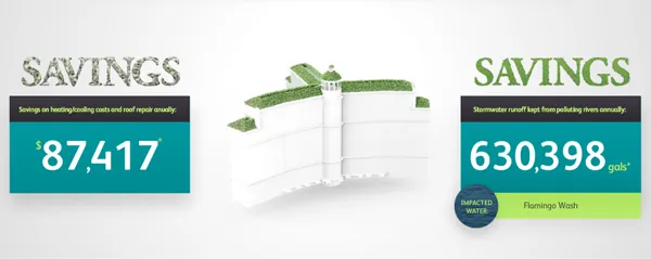 每年防止630,398加仑雨水径流污染火烈鸟冲洗节省$87,417的供暖和制冷费用
