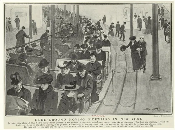 这一系列“地下移动人行道”的设计出现在 1903年2月28日的 哈珀周刊, 以及一篇关于城市如何应对拥堵问题的文章,正值新的桥梁连接将布鲁克林的通勤者和旅行者带入纽约市的前夕。