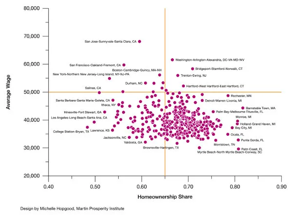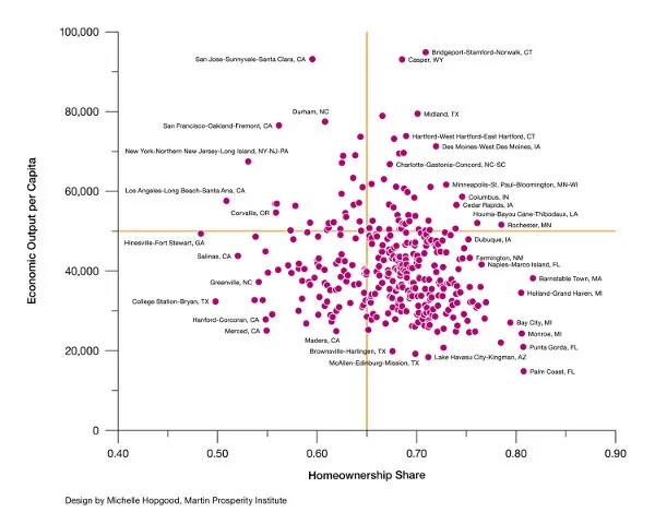上面的图表由 马丁繁荣研究所 的米歇尔·霍普古德制作,帮助我们从整体上看待这个问题,绘制了美国所有大都市地区房屋拥有权与人均经济产出之间的关系。这个模式实际上是五花八门的。