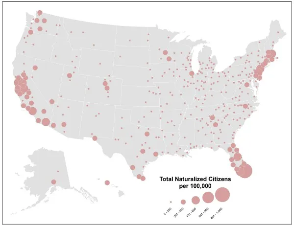 当我们控制总人口规模(通过查看每10万人中的归化公民数量)时,情况发生变化,如下图所示。虽然东海岸和西海岸仍然拥有显著的集中,但气泡并没有那么大,且在美国内陆也有点。