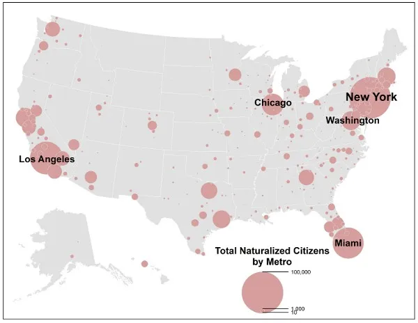 以下是2011年拥有最多入籍公民的大都市地区。纽约位居榜首,其次是洛杉矶和迈阿密。