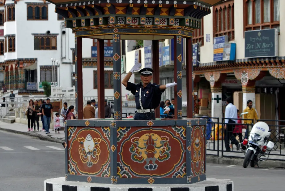 一名不丹交通警察在2012年5月21日的廷布指挥交通路透社廷布、楚卡、佩马嘉策尔和其他城市在 这个喜马拉雅王国的某些日子里非常安静,因为新禁令禁止驾驶。这个约有70万人口的国家的统治者决定,为了帮助保护环境,他们将在整个不丹的星期二禁止所有燃气动力车辆,除了公交车、出租车和紧急车辆。实际上,首相 吉格梅·廷列 在他的 行政命令中用更诗意的方式表达了这一点: