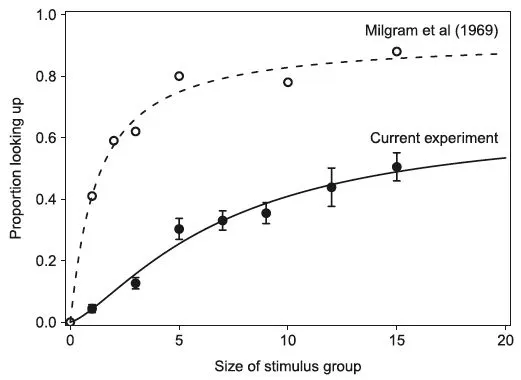 因此,正如米尔格伦所知,停下来看显然会鼓励更多的人停下来看。但本研究中的注视吸引力远没有米尔格伦所暗示的那么强。在米尔格伦的测试中,路过行人模仿某人注视行为的最大概率为92%。而在新研究中,这一高值仅达66%,而产生这一最大值一半所需的群体规模大了六倍。对反应数据的比较显示出显著的对比: