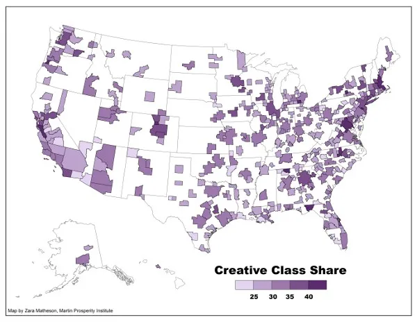 克里斯·巴伦/达勒姆会议与游客局下面的地图展示了美国城市和大都市地区的创意阶层。全国范围内,创意阶层总共有超过4000万工人,占总劳动力的三分之一以上,包括科学与技术、设计与建筑、艺术、娱乐与媒体、医疗保健、法律、管理和教育等领域的专业人士。