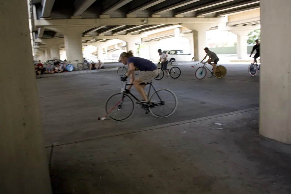 事实证明,美国城市非常适合举办硬地自行车马球。临时场地包括网球场、篮球场、停车场以及任何其他可用的沥青地面。三人一组的队伍竞争,试图用看起来像槌球槌的工具将一个小球送入球门。规则简单,但比赛节奏快速,有时甚至暴力。(2010年在柏林举行的世界锦标赛的精彩片段可以在 这里找到。)