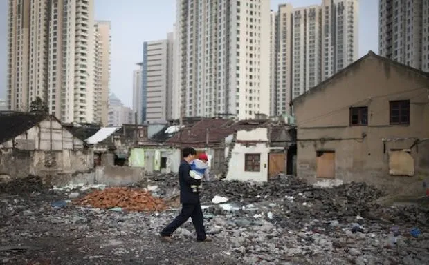 顶部图片:一名男子抱着婴儿走向他的房子,周围是旧住宅楼正在被拆除,以腾出空间给上海市中心的新摩天大楼。图片来源:Aly Song / Reuters