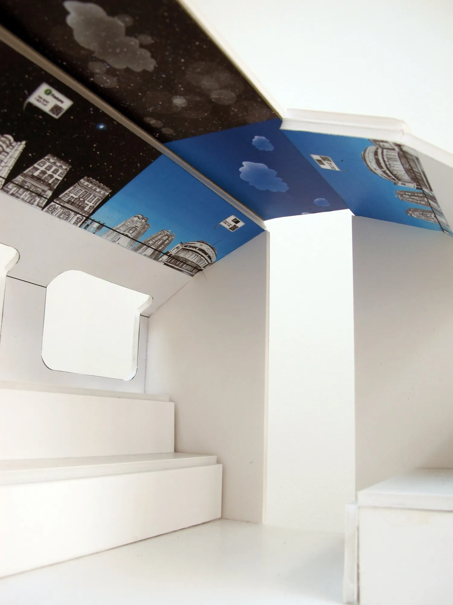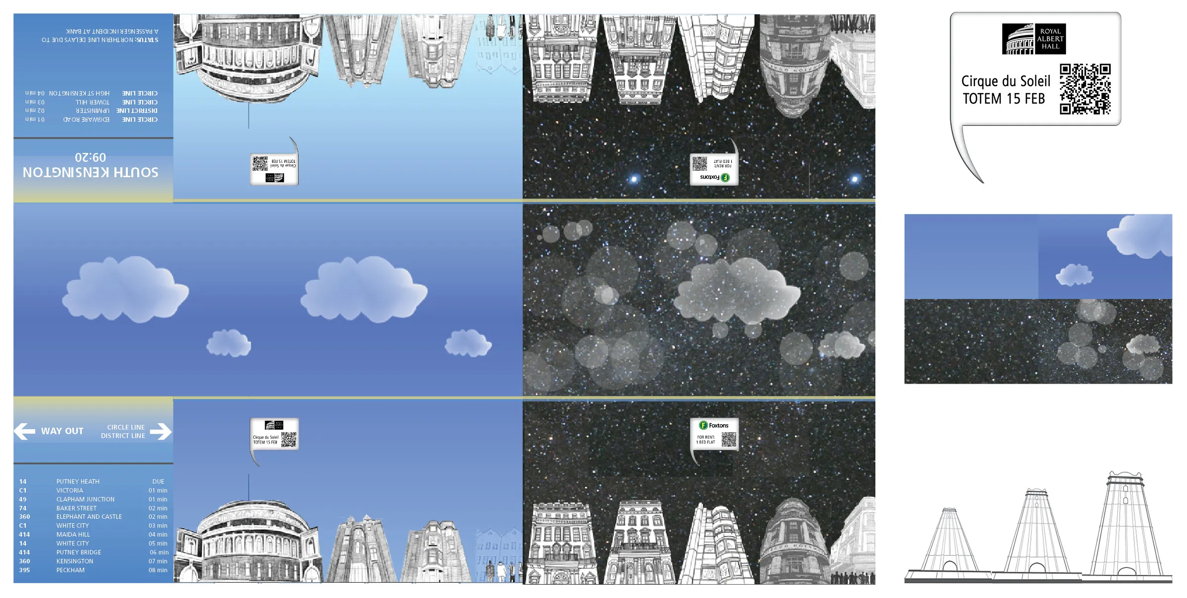 电子纸面板固定在地铁车厢的天花板上,但它们呈现出上方环境的滚动图像。显示器移动以模拟地面上生活的运动,但速度仅为火车实际速度的一小部分。这个显示器的运动速度不会干扰乘客观看图形的思维。这意味着只有上方环境的部分选择,即建筑、树木、人物等,会在显示器中展示。艺术家被邀请根据他们的美学来描绘环境,恰当地融入 TFL的地下艺术活动。