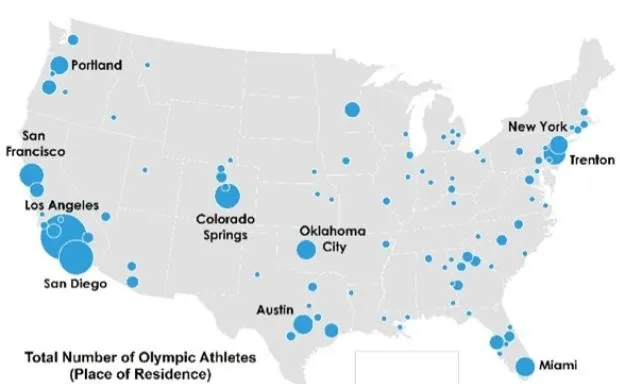 洛杉矶再次位居首位,但现在它拥有更高的运动员集中度:68名奥运选手,占美国队的15%,目前称其为家。附近的圣地亚哥以38名或8.5%的奥运运动员位居第二。科罗拉多斯普林斯以21名或5%位居第三。这些运动员聚集在圣地亚哥附近的丘拉维斯塔和科罗拉多斯普林斯的奥运训练设施周围。