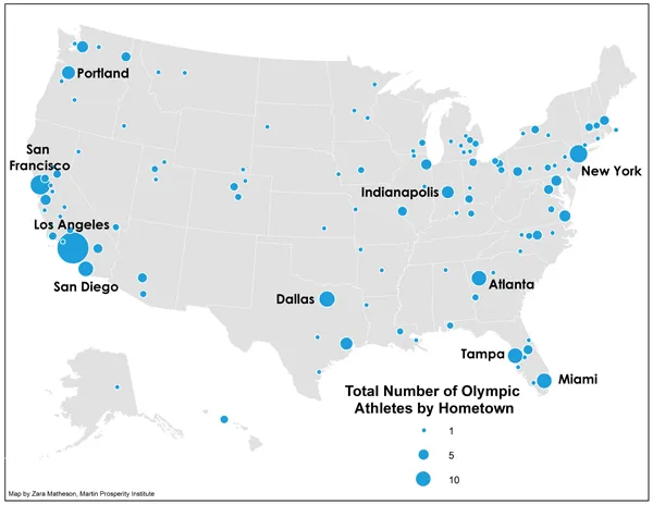 《华尔街日报》的一篇近期文章指出,美国在识别和培养年轻运动员方面的去中心化系统中获得了优势。不过,美国的奥运运动员确实会聚集,特别是在训练设施和卓越中心附近。与定义经济和社会生活许多其他维度的人才聚集相呼应,他们也从与彼此训练、竞争和相处中受益。