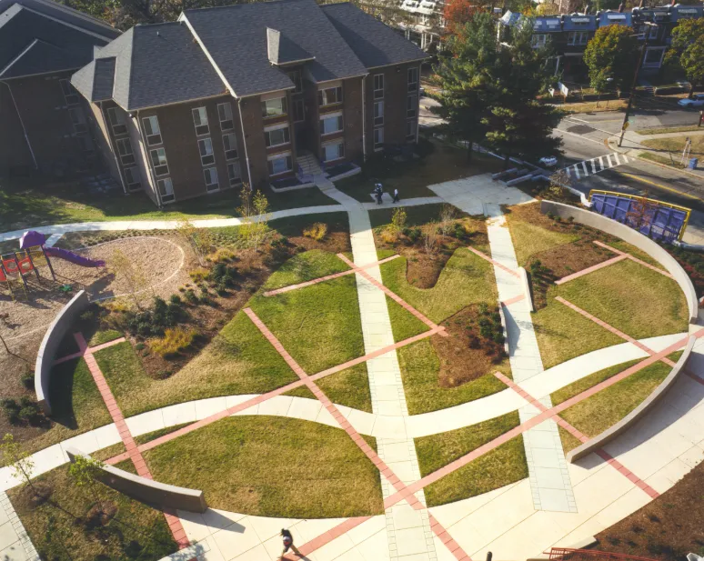 Wiencek在Edgewood Terrace的庭院中使用透视作为设计工具,这是一个位于华盛顿特区东北部的HUD住宅项目。广场中的角度和交叉点使得原本犯罪率较高的开发项目对公众更加友好,但又不至于过于友好——曲线的线条阻止了闲逛。这个图案为高层居民提供了一个大胆的俯瞰视角。