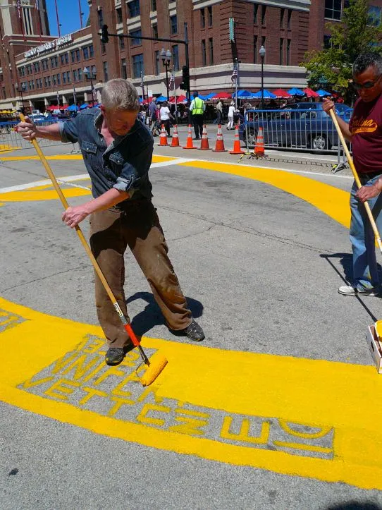 斯蒂德·泰勒,这就是怎么回事。这位52岁的艺术家几个月前访问了风城,参加了名为BIGArt的群展,庆祝大型作品,展出了罗伊·利希滕斯坦和南希·鲁宾斯等杰出艺术家的作品。泰勒的“Galloon”是一条约650英尺长、25英尺宽的凯尔特风格缠绕,是此次展览中更具视觉冲击力的作品之一。虽然很容易沉浸在路面纹身的表面美感中,但它的标题——galloon是一种常用于军装的编织装饰,强调了更为严肃、带有痛苦色彩的含义。