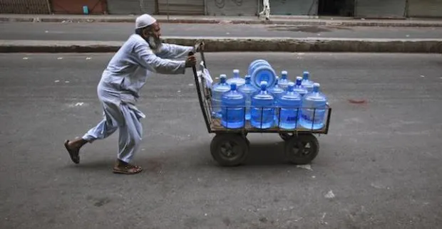 顶部图片:一名男子在巴基斯坦卡拉奇推着一辆装有水壶的手推车。来源:Akhtar Soomro / Reuters