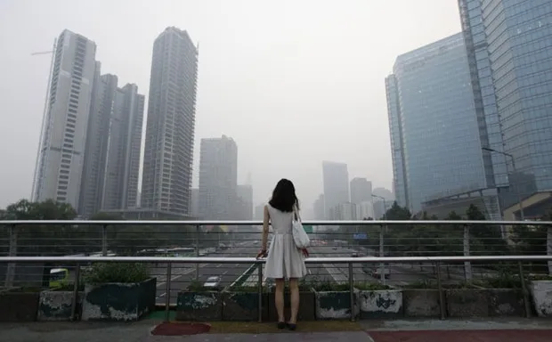 顶部图片:一名女性在北京中央商务区的一个高架桥上站着,天气阴霾(杰森·李/路透社)