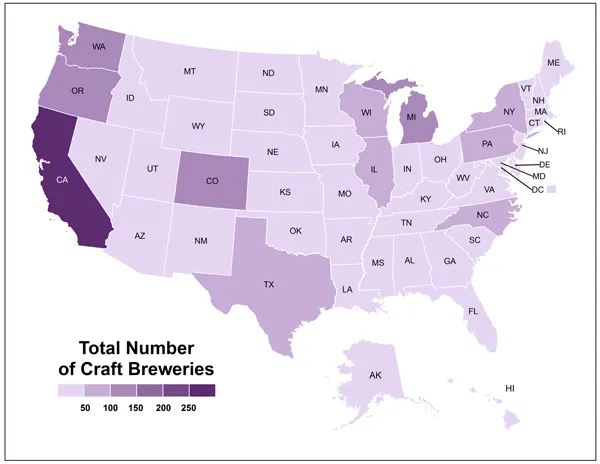 就数量而言,加利福尼亚州轻松获胜,如下图所示。它有261家酿酒厂,几乎是第二多的华盛顿州(134家)的两倍。科罗拉多州以127家排名第三,俄勒冈州以121家紧随其后,密歇根州以102家位列前五。