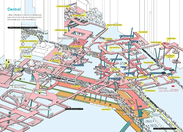 甚至香港的占领华尔街示威者也在这个网络中聚集,坐在汇丰银行大楼的中庭。城市的公共空间既不是完全公共的,也不是完全私人的。这似乎并不重要。所罗门说,这些人行道是城镇中极具活力的部分,代表了一种在城市中提供可用空间的新方法。无地城市中的地图试图表明,这种人行道系统——杂乱无章、非正式且几乎完全与城市的实际地面分离——对香港来说与任何其他城市的人行道和公共空间同样重要。