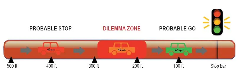 这实际上是一个交通工程师花费无数小时研究的问题。多年来,他们发现,当红绿灯变黄时,驾驶员的反应与他们是否处于“困境区”有很大关系,就像“危险区”但没有那么酷(这并不涉及高空空战)。这个区域是交叉口前的一段道路,长度根据汽车的速度而变化,在这个区域内,看到红绿灯变黄的驾驶员可能会感到很大的犹豫。