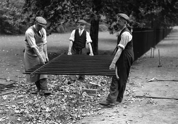 公共干预在1940年代初,为了战争努力,英国政府命令市民拆除围绕伦敦众多私人花园的高高黑色栏杆。铸铁障碍物从城市所有独占公园中被切除, supposedly 送往军火工厂,然后以另一种形式送往欧洲大陆。乔治·奥威尔称这一拆除为“民主的姿态”。
