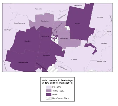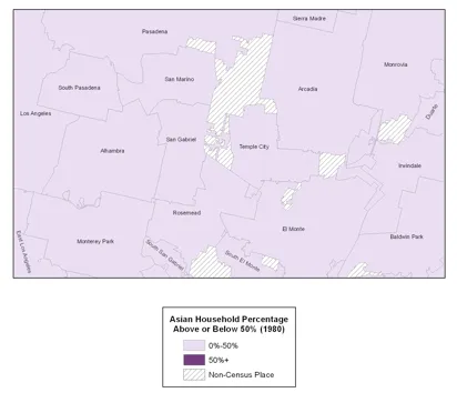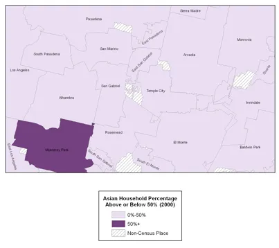 另一个山谷郊区,核桃市(未显示),与蒙特雷公园一起成为亚裔多数,亚裔家庭比例为53.1%。罗兰高地接近,达到49.8%。在1980年,它们的亚裔比例仅为7%和9.4%。至于蒙特雷公园,到2000年其亚裔家庭比例达到了60.7%,是1980年的两倍。