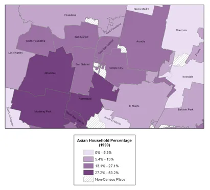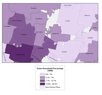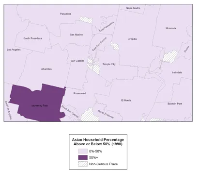 在圣加布里埃尔谷以外的洛杉矶县整体,变化则更加渐进。亚裔家庭的比例从1980年的4.9%增长到1990年的9.3%,这使得圣加布里埃尔谷的社区在人口统计上更加显著。许多新移民在此定居时,跳过了传统的郊区化过程,即先在城市核心的族裔聚居区定居,然后随着时间推移向郊区扩展。在圣加布里埃尔谷,郊区 成为 新的族裔聚居区和常见的首选目的地。
