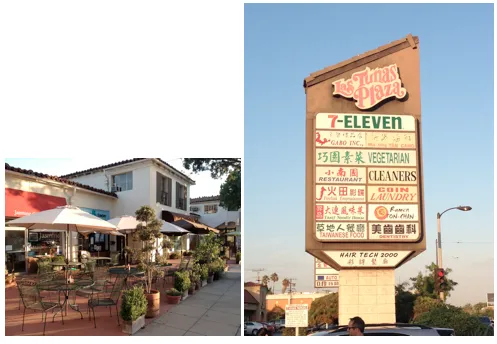 圣加布里埃尔谷抵制概括。它是一个小型郊区的集合,但它们几乎与文化传说中的统一白人社区毫无相似之处。它是一个巨大的移民飞地,但在种族和经济上与洛杉矶本身一样多样化。正如这些比较圣马里诺和圣加布里埃尔商业区的照片所示,亚洲影响在该地区的程度差异巨大,即使在相距仅几英里的社区之间:
