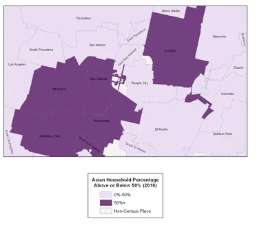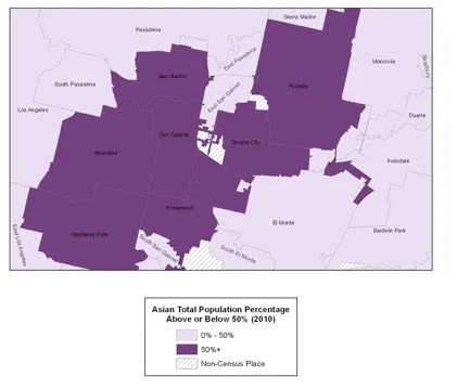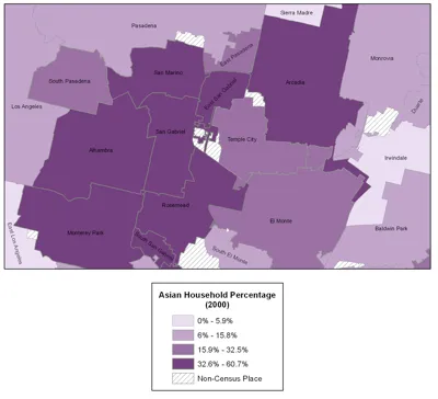 这种空间安排是加利福尼亚日益增长的亚裔人口的例外还是规则?也许两者都有。在洛杉矶县整体范围内,34.8%的亚裔家庭位于亚裔家庭比例为25%或更高的普查地点。仅有17.5%的亚裔家庭位于多数亚裔地区。在全国范围内,这些数字甚至更小,19.6%的亚裔家庭位于亚裔家庭比例为25%或更多的普查地点,只有5.7%位于多数亚裔地区。